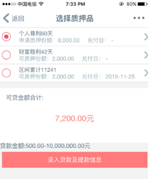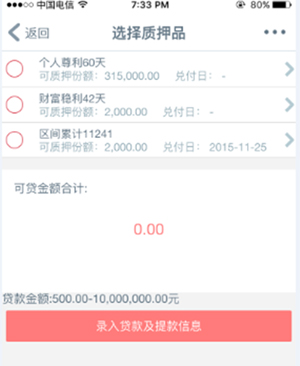 3、当客户有可以质押的理财产品的时候,会回显出理财产品的押品,选择理财产品
