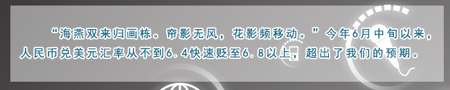 我们认为,7月以来人民币兑美元加速贬值是内、外经济和政策变化共同作用的结果。一方面,美国经济强势更甚,加速加息渐成市场共识。今年二季度,美国经济动能较一季度明显提升,实际和名义增速环比折年率分别创下了2014 年三季度、二季度以来的新高。随着实体经济的稳健上行,通胀预期真正回暖,鹰派加息的力度超出前期市场共识,美元指数维持在年内高位。另一方面,中国经济在调结构的大背景下基本面稳中有变,政策出现边际调整。今年上半年,中国经济增速稳定在6.8%,但在内、外宏观拖累因素同时出现的情况下,下行压力加大。尽管政策基调并未发生改变,但在节奏把握和工具搭配方面有明显调整,以资管新规、理财新规为代表的具体措施在执行范围、力度、节奏上将适时适度放松,宏观政策在短期内更注重搭配和缓冲。在内、外均衡发生移动的情况下,人民币汇率也出现加速贬值,CFETS指数从6月底的95.66降至7月底的92.41,而同期兑美元汇率从6.62贬至6.82。为了分解源于美元走强的被动贬值和由基本面相对变化引起的贬值,可以将人民币对美元汇率变动拆成人民币对其他的篮子货币和篮子货币兑美元的汇率变动两部分。我们的计算表明,对于年初至7月底人民币兑美元贬值4.1%而言,这两个因素的贡献各约一半,但从时间分布上却有明显的区别:今年1月至5月中旬,尽管其他的篮子货币兑美元先走强后走弱,但人民币对一篮子货币总体升值;5月中旬至6月下旬,强势美元所带来的其他货币贬值主导了人民币兑美元走势,如果不考虑被动贬值,人民币兑美元的汇率将稳定在6.3-6.4的区间内;6月下旬至7月底,其他篮子货币对美元汇率变化不大,该阶段的贬值大致由人民币自身主导,反映了内、外基本面的相对变化。