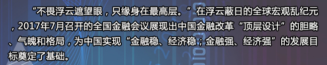 金融究竟是什么?金融到底应该怎么办?这些基础性问题对于转型中的中国而言,始终举足轻重。2017年全国金融工作会议在隐约之间,给出了重要答案。第一,将金融事业定位在“国之重器”的高度。无论从会议召开时间、参与层次,还是从会议通报的言辞之间,都能捕捉到一个信息,金融的地位拔高了。金融不仅是一个重要行业,更是国之血脉。习近平总书记强调:“金融是国家重要的核心竞争力,金融安全是国家安全的重要组成部分,金融制度是经济社会发展中重要的基础性制度”;李克强总理则直言不讳地指出:“金融是国之重器”。