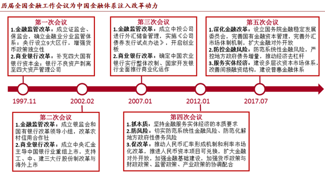 正因为金融地位得以拔高,所以金融改革才会选择更加稳健、务实、有序的节奏,而理解本次会议,也更需要从短视的技术层面上升到长期的战略层面。我们认为,本次会议意义深远,而改变将会渐次发生,三大效应有望逐步释放。第一,重点明确的风险管控将带来综合监管效应。金融稳则经济稳、国家稳,本次会议提出要“整治金融乱象”,这种措辞再次表明了金融监管趋严的紧迫性和严肃性,而当前监管任务落实的主要抓手则是“去杠杆”和“控风险”。本次会议强调“要把国有企业降杠杆作为重中之重,抓好处置僵尸企业工作”,“要坚决整治严重干扰金融市场秩序的行为,严格规范金融市场交易行为,规范金融综合经营和产融结合,加强互联网金融监管,强化金融机构防范风险主体责任”。阵痛不可避免,监管执行的决心不可动摇,综合监管效应将渐次显现。第二,稳中有进的改革开放将带来长期鲶鱼效应。将金融拔高为“国之重器”,将党置于领导金融发展的核心地位,这意味着中国金融改革开放的大趋势将更加不可动摇,任何利益藩篱都无法阻挡改革推进,任何市场乱象都无法干扰稳步开放。